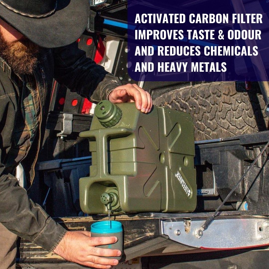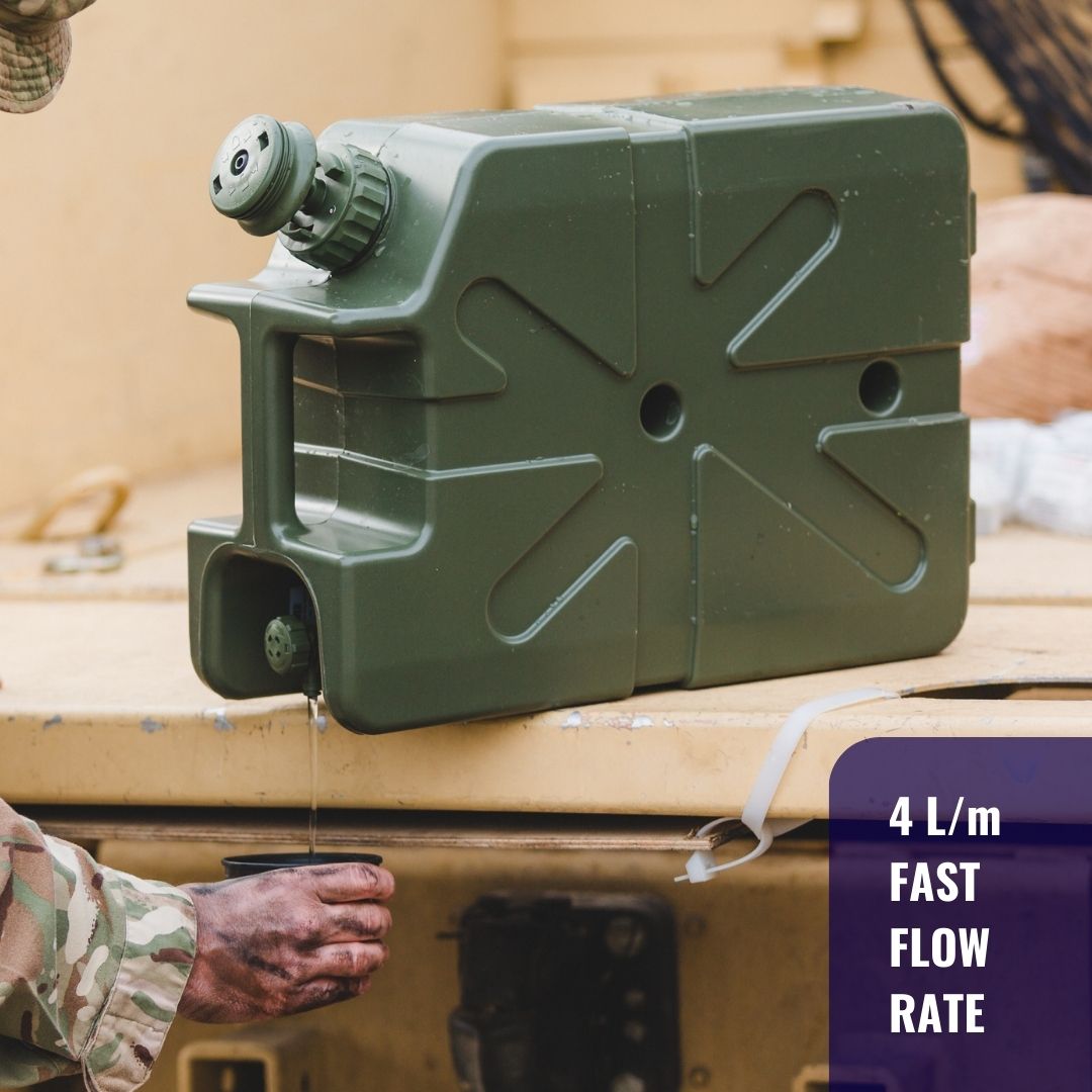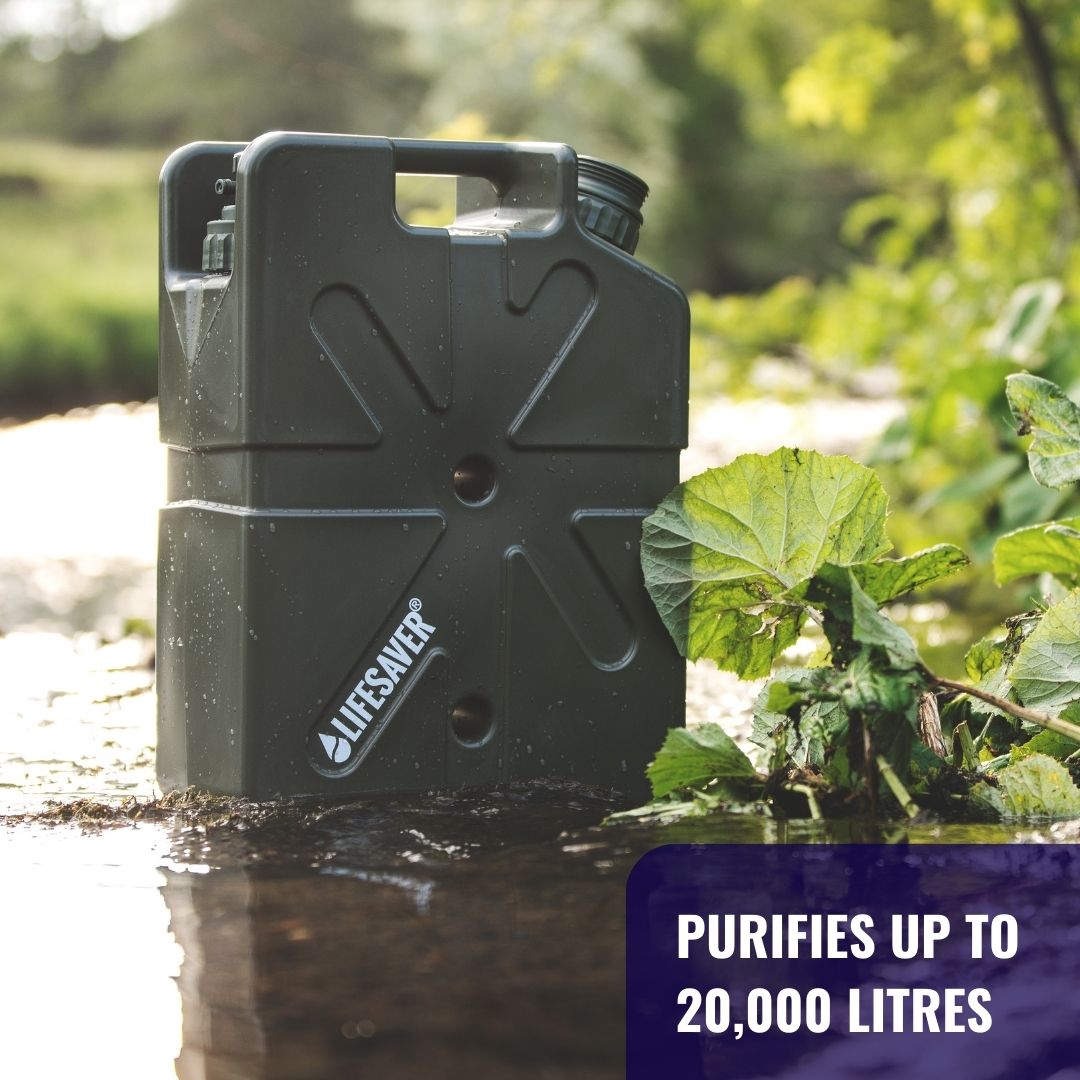 A robust and portable water purifier capable of filtering 20,000 litres/5,300 US gallons of clean drinking water, removing viruses, bacteria, cysts and parasites instantly. The LifeSaver Jerrycan holds up to 18.5 liters of water at any one time and is designed to support those with a greater demand for clean water such as group expeditions, adventurers embarking on overland travel, families or those setting themselves up for off-grid living.