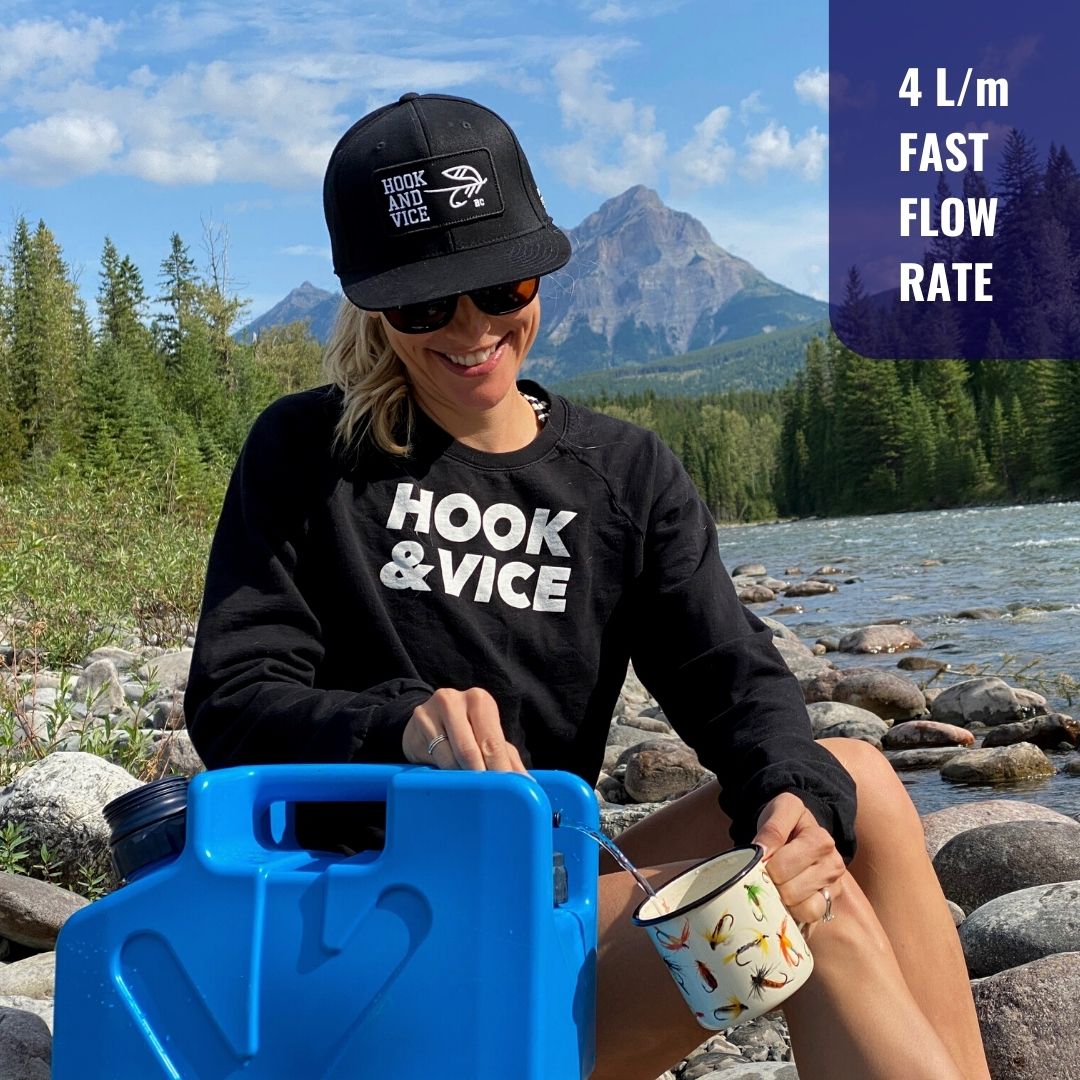 A robust and portable water purifier capable of filtering 20,000 litres/5,300 US gallons of clean drinking water, removing viruses, bacteria, cysts and parasites instantly. The LifeSaver Jerrycan holds up to 18.5 liters of water at any one time and is designed to support those with a greater demand for clean water such as group expeditions, adventurers embarking on overland travel, families or those setting themselves up for off-grid living.