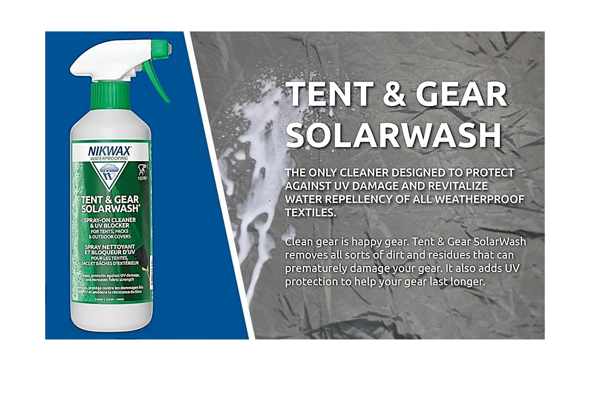 The only cleaner designed to protect against UV damage and revitalize the water repellency of all weatherproof textiles. Nikwax Tent & Gear SolarWash is an easy-to-use spray-on cleaner and UV protector that extends the life of synthetic tents and equipment by up to 50%. Easy to apply by hand, non-flammable, PFC and aerosol-free.